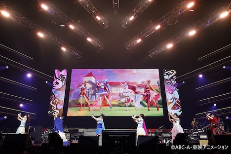 本日のセットリストは20周年イヤーとして展開中の「プリキュア」の楽曲も満載。会場が暗転すると、突如プリキュアの敵キャラクター・カバトンの声が響く。観客のエネルギーを察知したカバトンの悪巧みにすぐさまキュアスカイとキュアプリズムが駆けつけステージがスタート。石井あみが「ひろがるスカイ!プリキュア ~Hero Girls~」、