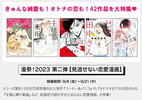次週以降も、毎週金曜に新しい特集がスタート。9月8日からは第2弾「見逃せない恋愛漫画」特集が始動する。以降も「読み応えたっぷり青年漫画」「10月ドラマ化の話題作も!映像化漫画フェア」などの特集をラインナップ。詳細は「小学館 漫祭!2023」の公式サイトをチェックしよう。