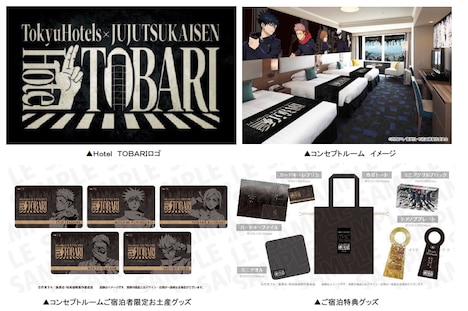 東京・渋谷エクセルホテル東急では10月5日から2024年1月下旬まで“帳に包まれたホテル”がコンセプトの「Hotel TOBARI」と題した企画を展開。装飾を施した「呪術廻戦」初のコンセプトルームが登場し、宿泊特典や宿泊者のみ購入可能な数量限定のお土産グッズも用意される。本日9月4日に予約受付が開始した。さらに、ホテル内のカフェ、レストランではコラボメニューも販売。メニューや特典などの詳細は9月下旬に発表され、予約受付も同タイミングに開始を予定している。
