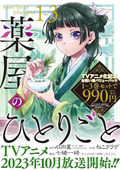 また「薬屋のひとりごと」のTVアニメ版が10月21日から放送されることを記念し、単行本1巻から3巻までをまとめたバリューパックが販売されている。なお「薬屋のひとりごと」のしおりがもらえるフェアが全国の参加書店で開催中。店頭で「薬屋のひとりごと」1巻から11巻までのいずれか1冊を購入すると、しおりが全5種の中から1枚もらえる。