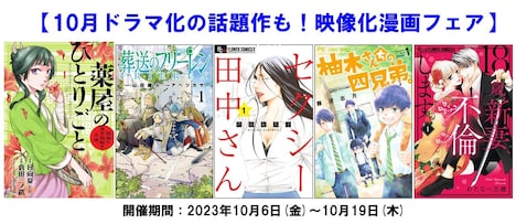 本日より展開されている「10月ドラマ化の話題作も!映像化漫画フェア」では、10月22日にTVドラマの放送がスタートする「セクシー田中さん」や、TVアニメが放送中の「葬送のフリーレン」など、映像化された作品の無料試し読みが登場。気になるマンガがある人はこの機会にチェックしてみよう。