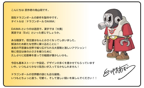 これはアメリカ・ニューヨークで現在開催中のイベント「ニューヨーク・コミコン」にて発表されたもの。「ドラゴンボールDAIMA」は、鳥山がまったく新しいエピソードを執筆した完全新作アニメシリーズで、タイトルは鳥山が「これまでとはまた違った強めなネーミングを」と考案した。解禁されたティザー映像では、悟空たちと魔人ブウの激闘を見つめる謎の新キャラクターや、今までにないまだ見ぬ世界、悟空、ベジータ、ブルマなどおなじみの面々の新しいビジュアルが描かれた。