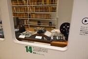 地下のフロアには東京都が保管するセル画など、アニメーションの中間成果物を約5万点収蔵。展示コーナーも設けられており、アニメ制作の流れが、18の工程に分けて貴重な資料とともに解説されている。企画、シナリオ、設定・デザイン、絵コンテの紹介では「ASTROBOY鉄腕アトム」の企画書や絵コンテの一部を見ることが可能。「タイムボカン」の演出を務めた岡本良雄から寄贈されたという傷だらけの作画机からは、制作スタジオの空気感も感じ取れる。またカット袋、タイムシート、フィルム編集でフィルムをカットしたりつないだりするスプライサー、アニメが実際に焼き付けられた35mmフィルムなど、アニメには欠かせないが、なかなか表に出てこないようなアイテムがずらりと公開された。