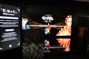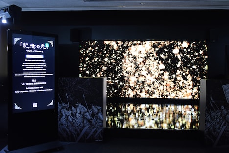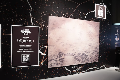 「インタラクティブアート『栄光の光』」では、エリア中央に自由に触れるタッチパネルが。タッチパネルには作中で描かれる合戦の名前が表示されており、その中から1つ選ぶと飛信隊や武将たちの熱いセリフが360°のプロジェクションマッピング空間に投影される。その隣は「ARマンガ体験『感謝の光』」。壁面の大きな地図にスマートフォンをかざすと、合従軍編の「函谷関の戦い」がその場で展開される。