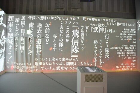 最初のエリアは「ハプティクスブース『記憶の光』」。床が映像や音に合わせて振動し、来場者は自分も戦場に立っているかのような感覚を味わえる。会場で一番広いエリア「イマーシブ体験『挑戦の光』」では、約25分間の映像を空間全体を使ってお届け。天下の大将軍を目指す信、中華統一を志す政の姿がダイナミックに映し出される。