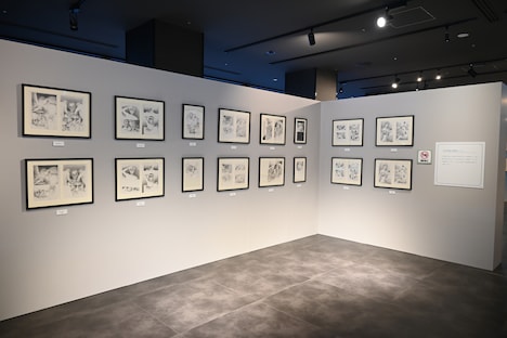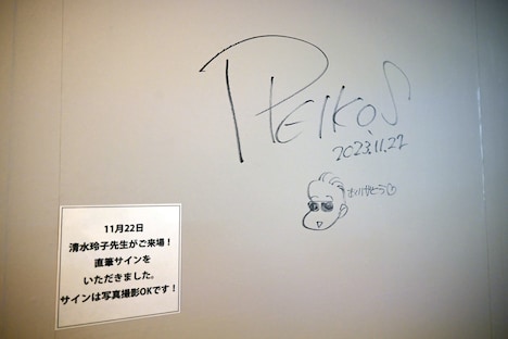 続いてスクリーンが登場し、2017年3月にNHKで放送された「浦沢直樹の漫勉」より、清水が出演した回の動画が映し出される。さらに原画展開幕前日の11月22日には清水自身も会場に足を運んだそうで、スクリーン脇の壁には清水によるサインが書かれていた。