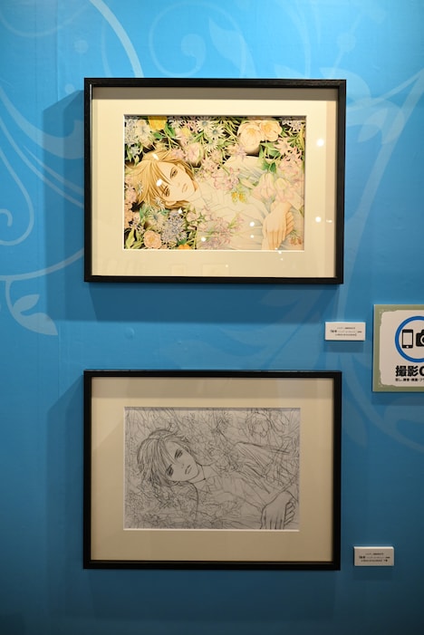 展示内容は清水が“今見てほしいもの”を編集部や主催者とともに相談しながら選別したとのこと。原画展の担当者は、「清水玲子先生のイラストは言うなれば1点1点絵画のようなものなので、原画展では美術館をイメージして、作品1つひとつを額に入れて展示しました」と話す。そんな美術館風の会場では清水がこれまでに手がけた作品が時系列順に展示されており、最初は「ジャック&エレナ」シリーズや「月の子 MOON CHILD」のカラーイラストが続く。一部では完成されたカラーイラストとその下書きが対比する形で展示された。