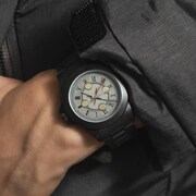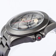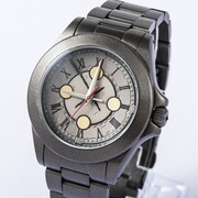 登場したのは、腕時計、アウターとネックレスのセット、バックパックの3種。いずれのアイテムもデザインにゴブリンスレイヤーの無骨な佇まいが落とし込まれている。腕時計の盤面は、彼が携える盾をイメージ。盾の装飾から、大小さまざまな傷まで再現されている。剣を模した時針や、4の目を指すサイコロのモチーフもポイントだ。
