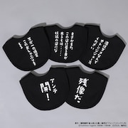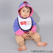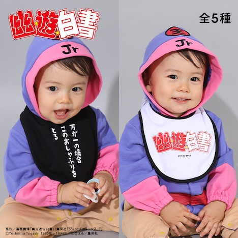 「コエンマなりきりロンパース」のフードには「王」のワッペンと「Jr」の刺繍をあしらってコエンマの帽子を再現。綿100%で制作されており、赤ちゃんの着心地にもこだわっている。「名言スタイ」は全5種で、飛影の「残像だ」やコエンマの「万が一の場合 このおしゃぶりをとる」、戸愚呂弟の「酒はダメなんでオレンジジュースください」といったセリフをデザイン。裏面には作品ロゴがプリントされ、リバーシブルで楽しむことができる。