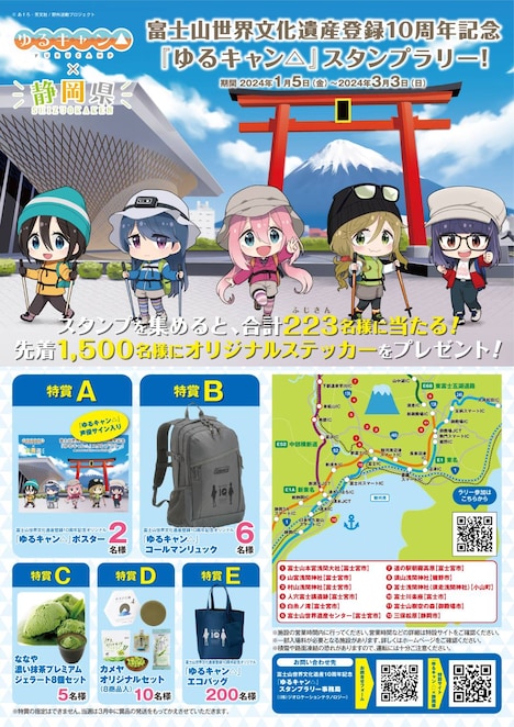 さらに2024年1月5日から3月3日までの期間、「ゆるキャン△」と静岡県がコラボしたスタンプラリー企画「富士山世界遺産登録10周年記念『ゆるキャン△』スタンプラリー」が開催決定。参加希望者は、静岡県公式観光アプリ・TIPSをダウンロードし、静岡県内の世界遺産構成資産8カ所と周辺観光施設4カ所に設置されている二次元コードを読み込んでスタンプを集めよう。スタンプの獲得数に応じて、記念品がもらえるほか、特賞の抽選に応募することができる。詳細は、スタンプラリー企画の特設サイトで確認を。