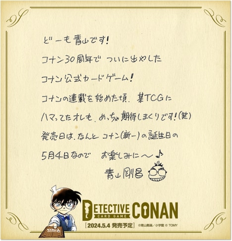 これは同作の30周年を記念して企画されたもの。第1弾では1パック6枚入の拡張パック「CTP01 名探偵コナンTCG Case Booster 01 探偵たちの切札(ジョーカー)」と、42枚入りのスタートデッキ「CTD 01 名探偵コナンTCG Case StartDeck 01 江戸川コナン」などが発売される。スタートデッキには江戸川コナン、服部平次、怪盗キッド、赤井秀一、安室透の5人のキャラクターを封入。また「名探偵コナンカードゲーム」シリーズでは青山描き下ろしのカードやシリーズならではの描き下ろしカードが収録される予定だ。青山からのコメントも到着している。