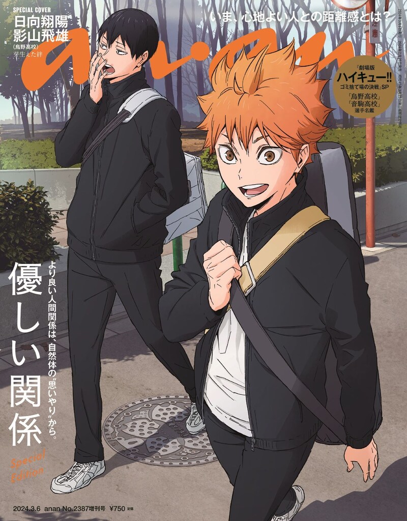 表紙を飾るのは日向翔陽と影山飛雄の2ショット。裏表紙には孤爪研磨と黒尾鉄朗が描かれた。2枚の描き下ろしの設定は“ある朝の邂逅”。ジャージに身を包み会場に向かう道すがら、わくわくした表情でこちらを見る日向に対し、研磨はポーカーフェイスでゲームをしながら歩いている。眠そうにあくびをしているのは影山と黒尾。自然体の4人が、映画では描写されない場面で表現された。