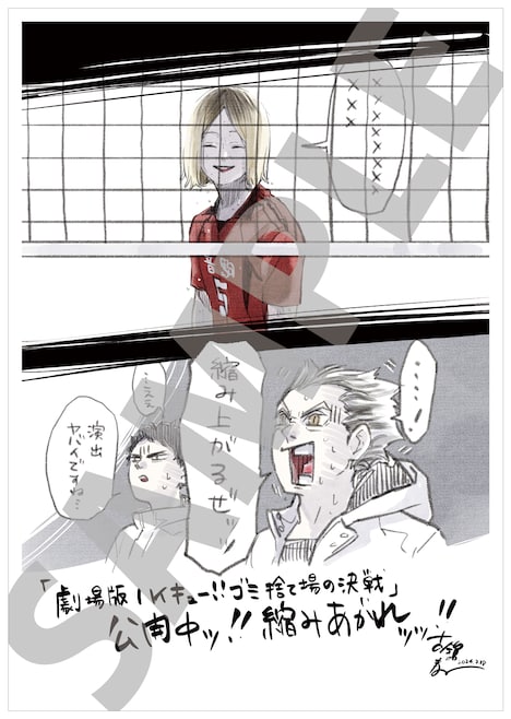 2月16日に劇場公開され、3月24日までで観客動員数550万人、興行収入は79億円を突破している「劇場版ハイキュー!! ゴミ捨て場の決戦」。「感謝観戦!古舘先生描きおろしビジュアルボード」は、最速上映舞台挨拶で公開された孤爪研磨のイラストなど3種類が用意され、ランダムで配布される。
