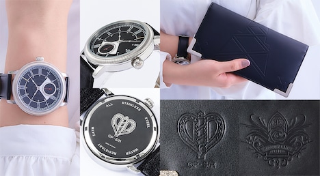水銀燈のキャラクターカラーを基調とした腕時計は、盤面に衣装をイメージした逆十字や編み上げをデザイン。「I」のインデックスには第1ドールを意識してゴールドを、インダイヤルの針には水銀燈の瞳を思わせる赤を配色した。裏蓋にはドールのシンボルである「薔薇の薇(ゼンマイ)」が刻印されている。長財布には表面に編み上げ模様、内側に「薔薇の薇(ゼンマイ)」やSuperGroupiesオリジナルの水銀燈をイメージしたエンブレムを型押し。ジッパー部分にはアクセントとして赤い布地があしらわれた。