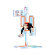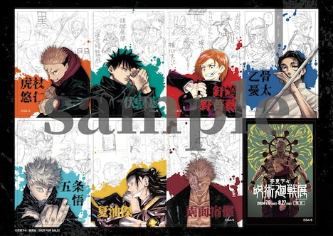 オリジナルグッズはステッカーやアートボードなど定番のものから、七海建人、五条悟、禪院真希の3人をモチーフにしたメガネクロスまでラインナップ。来場者特典のステッカーは8種の絵柄を組み合わせたデザインで、同展のキービジュアルをはじめ、キャラクターのカラーイラストとそれぞれの印象的なシーンの下書きで構成されている。