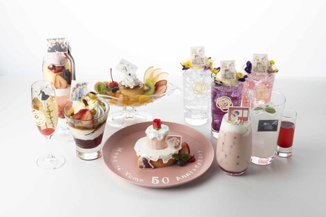 展覧会会場に併設するカフェ・THE SUN & THE MOONではコラボカフェを展開。「ガラスの仮面」のマヤ、亜弓、月影先生、真澄社長たちが、創刊50周年をお祝いするイメージで作られたアニバーサリーケーキや「フルーツバスケット」にちなみ「フルーツ盛りだくさんのバスケット」、「暁のヨナ」の舞台をイメージしたアジアンスイーツのパフェなどのフードのほか「花ざかりの君たちへ」「ぼくの地球を守って」などのドリンクがラインナップされている。