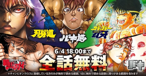 またスピンオフ作品を含む「刃牙」シリーズの全話無料公開キャンペーンが、本日5月21日から6月4日18時までチャンピオンクロスで実施される。対象のラインナップは記事末に記載の通り。