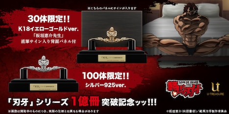 さらに累計発行部数1億部突破記念に、範馬勇次郎の股割り姿がフィギュア化。フィギュアはK18イエローゴールドとシルバー925の2種類があり、前者は30体限定で税込385万円、後者は100体限定で税込38万5000円で販売される。商品は本日から8月15日までU-TREASUREにて受注販売。商品は11月22日頃より順次発送される。