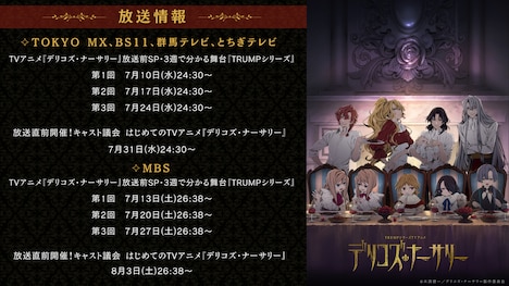 なお7月10日からは3週にわたり、「TVアニメ『デリコズ・ナーサリー』放送前SP・3週で分かる舞台『TRUMPシリーズ』」と題し、演劇作品「TRUMP」シリーズをオンエア。7月31日には「放送直前開催!キャスト議会 はじめてのTVアニメ『デリコズ・ナーサリー』」が放送される。同番組にはダリ・デリコ役の