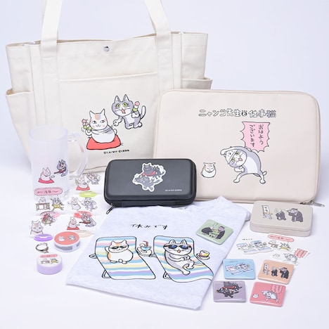 コラボグッズには缶バッジ、ステッカーセット、Tシャツといった定番のグッズが用意された。また台の上に乗ったニャンコ先生の前で「はい注目~」と言う仕事猫が描かれた防犯ブザーや、仕事猫がニャンコ先生に酒を注ぐイラストがデザインされたフロストジョッキも販売される。