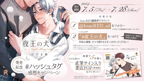 一部書店では店舗購入特典を配布。また本日から7月28日まで、けだまの直筆サイン入りポスターが抽選で5人に当たるハッシュタグ感想キャンペーンも行われている。from REDの公式Xアカウント(@fromRED_ed)をフォローしたうえで、ハッシュタグ「#夜王の犬」を付けて感想を投稿しよう。