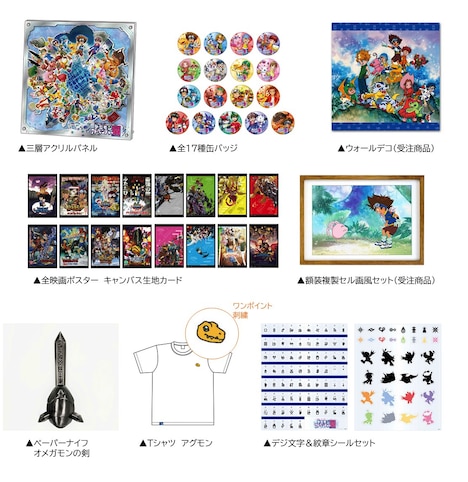 グッズにはこれまでの映画ポスターを網羅したキャンバス生地カードなど、「デジモン」アニメシリーズの歴史を感じられるアイテムがラインナップ。イベントビジュアルを使用したアクリルパネルや、オメガモンの剣を模したペーパーナイフ、デジ文字と紋章のシールセットなども用意された。