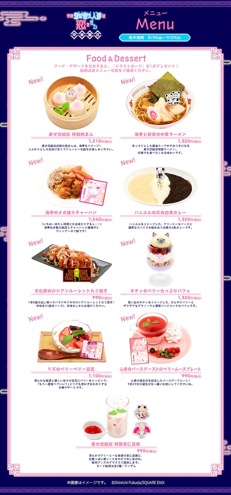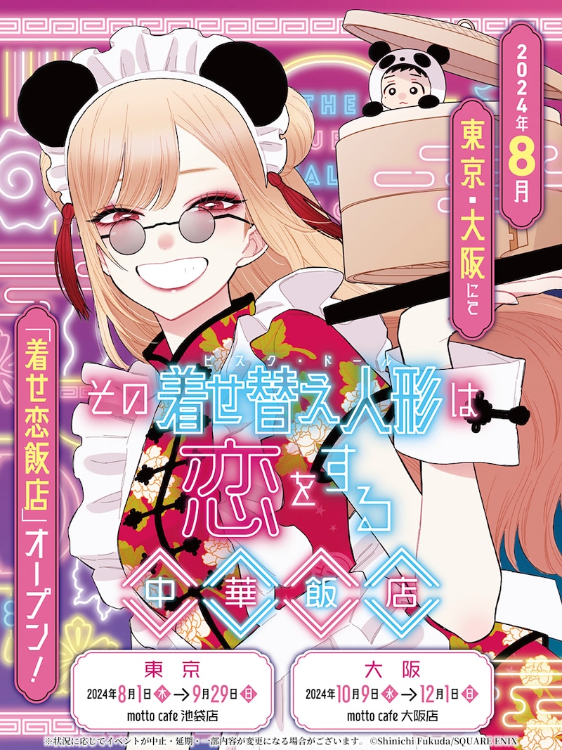 「その着せ替え人形は恋をする 中華飯店」の利用は、前半期間に引き続き先着予約制となっている。店内利用の予約は8月9日18時30分に、テイクアウトの予約は8月23日18時30分にスタート。予約可能回数は1人につき店内・テイクアウトそれぞれ3回までで、人数は店内利用が2人、テイクアウトは1人まで申し込むことができる。