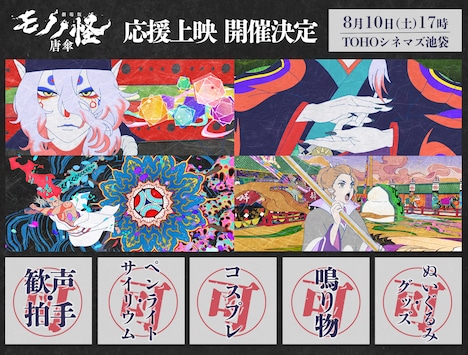 さらに応援上映限定の来場者特典として、作中に登場する“モブ女中”のぐるぐるした顔を描いたお面風のうちわ「モブ女中ぐるぐる顔お面」を配布。“モブ女中”の顔色である黒、青、緑、黄、赤の5色の中からランダムで1枚プレゼントされる。チケットは明日8月7日24時にインターネットで販売開始。シネマイレージ会員は、8月7日21時から予約を受け付ける。