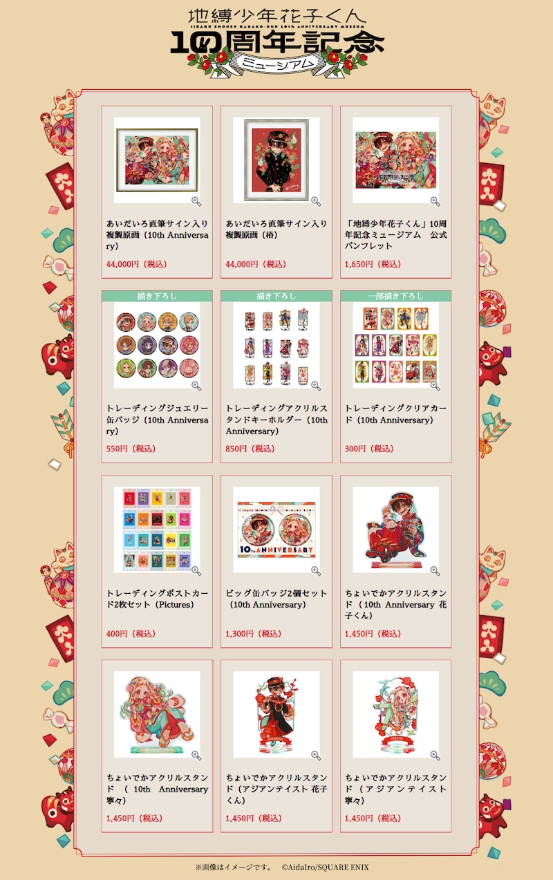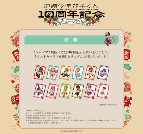第2弾では「地縛少年花子くん10周年記念ミュージアム」の公式パンフレットが登場。そのほか描き下ろしイラストを使用したきらびやかな「トレーディングジュエリー缶バッジ」やトレーディングアクリルスタンドキーホルダー、相合傘や恐竜などのテーマに沿ったイラストを使用したアートボード、ミニアクリルブロックなどがラインナップされた。また会場では、対象商品を税込2000円購入するごとに、イラストカード全12種のなかからランダムで1枚をプレゼント。なお一部商品には購入制限が設けられた。