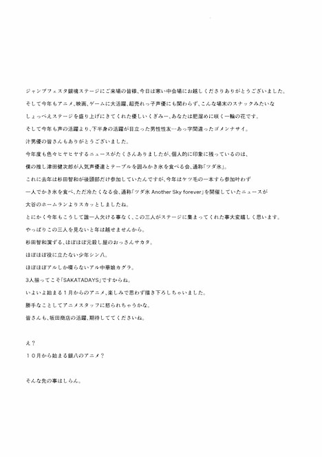イベントの終盤には、恒例となった空知からのメッセージを釘宮が代読。今回は手紙ではなく、教室風のセットに合わせ、ノートにメッセージが綴られた。メッセージ内では鈴木祐斗「SAKAMOTO DAYS」のTVアニメが2025年1月より放送となることに触れ、空知が「SAKAMOTO DAYS」風に万事屋メンバーを描き下ろしたイラストも公開された。