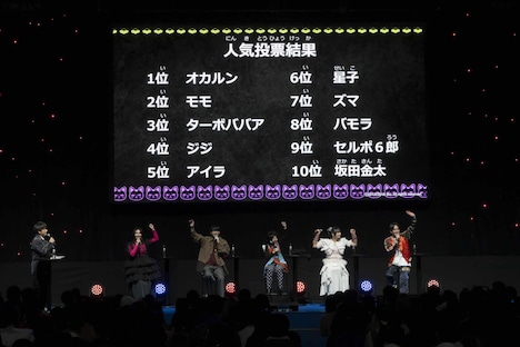 ステージにはターボババアとセルポ星人も登場。田中は背中にターボババアのぬいぐるみを背負って登壇した。イベントが開幕してすぐに、わきあいあいとした雰囲気でトークを交わし始めるキャスト陣。「ダンダダン」ステージイベント初登壇となった石川は、30分という短い時間での開催というところで、早口で会場の熱気のすごさや作品ファンへの感謝の言葉を述べた。