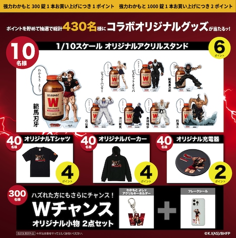 キャンペーンでは300錠の「強力わかもと」1本購入ごとに1ポイント、1000錠を1本購入ごとに2ポイントを進呈。専用応募サイトにレシートの写真をアップロードすることでポイントを貯めることができる。貯まったポイントに応じて「強力わかもと」とキャラクターが並ぶアクリルスタンドや、Tシャツ、パーカー、充電器といったコラボグッズが計430人分に当たる抽選に応募が可能だ。また抽選に外れた場合でも300人にシールとアクリルキーホルダーのセットが当たるWチャンスも用意されている。