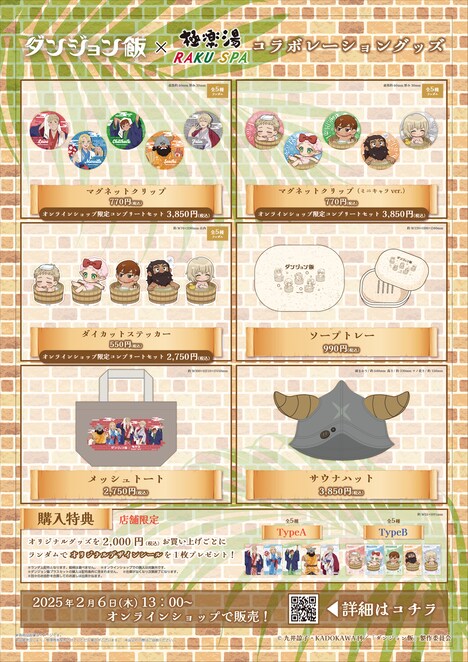 「ダンジョン飯×極楽湯・RAKU SPAキャンペーン“冒険者たちのオアシス”」と題されたこのキャンペーン。コラボビジュアルには浴衣姿のライオス、マルシルらが描かれた。期間中は入館時に「ダンジョン飯プラスセット」を購入すると、コラボ限定のマフラータオルが全5種から1枚プレゼントされる。また店舗や浴室が装飾されることに加え、コラボ風呂も展開。コラボ風呂は「迷宮地下1階 地下墓地の湯」など迷宮地下1階から地下5階までを表現した5種で、期間により内容が異なる。