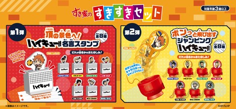メインメニューにプラス税込230円で「ハイキュー!!」のオリジナル玩具と「カットりんご」「選べるドリンク」が一緒に付いてくる「すきすきセット」も販売。「ハイキュー!!」の玩具は期間を分けて2種が用意されており、2月4日9時からはスタンプを押すとキャラクターが上部から飛び出す「ハイキュー!!名言スタンプ」、3月14日9時からはボタンを押すとキャラクターのパネルが跳ね上がる「ジャンピングハイキュー!!」をもらうことができる。ともに日向や影山、研磨、黒尾、木兎ら8種がラインナップされている。なおグッズはなくなり次第配布終了。第1弾の在庫状況により、第2弾の配布タイミングが早まる可能性があるのでご注意を。