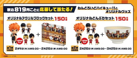 また期間中は税込819円以上の購入ごとに、「ハイキュー!!」のグッズが当たるWeb抽選にキャンペーンの特設サイトから参加可能。第1弾では「ねんどろいどハイキュー!!」とオリジナルビジュアルがデザインされたアクリルブロック、第2弾では「ねんどろいどハイキュー!!」とオリジナルビジュアルがデザインされたコラボどんぶりが用意された。
