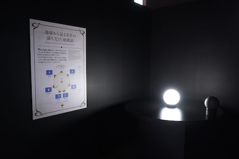 謎を解き明かしてほしいというフベルトの映像を挟み、展示がスタート。最初のエリアには中世の天体観測用機器・アストロラーベを動かせるコーナーや、アニメ第3話でのラファウが小窓から空を見上げるシーンを再現したフォトブースが設けられた。第2章のエリアでは、アニメ第9話でオクジーが見えるはずのない天体・満ちた金星を観測したときのシーンを映したスクリーンが登場。また地球から見た、「天動説」と「地動説」の金星の満ち欠けを体感できるコーナーも設置された。このコーナーでは、自らが地球の視点となり、太陽を模した丸い照明に向け、金星を模した球体が置かれたターンテーブルを回すことで、それぞれの満ち欠けの違いを知ることができる。