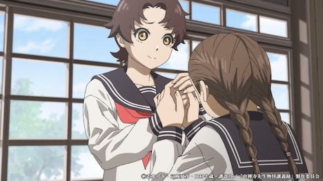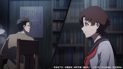 4月7日より放送されるアニメ第1話に登場する怪異は「図書室の幽霊」。新制高校の2年生になった栞奈はある日、友人たちから「図書室の幽霊」を見た者は、その呪いにより1カ月以内に死に至ってしまうという噂を耳にする。その幽霊を目撃してしまったと怯える栞奈の友人の幸子。死にたくないと嘆く彼女を放っておけない栞奈は、幽霊の正体を探ることを決意する。そんな矢先、栞奈のクラスに新任の講師・中禅寺秋彦が赴任してきて……。アニメでは栞奈役を