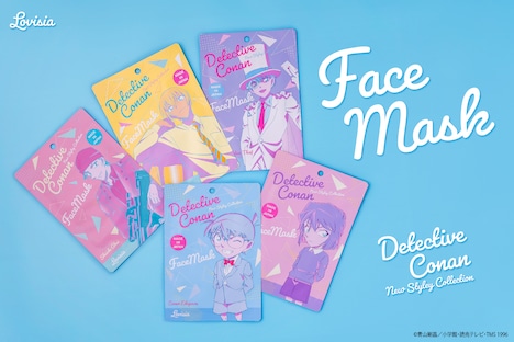 フェイスマスクは江戸川コナン、怪盗キッド、灰原哀、赤井秀一、安室透の全5種。マスクには各キャラクターのデフォルメイラストが描かれている。またLovisiaのオンラインショップでリップクリーム、フェイスマスクを税込2200円以上購入した人には、「Lovisia 名探偵コナンマルチクロス」を1回の購入につき1枚プレゼント。なくなり次第終了となる。