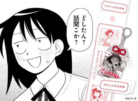 このポップアップショップは、主人公・鳩野ちひろたちが通う谷九高校の軽音部に体験入部できるというコンセプト。体験コンテンツ「どしたん?話聞こか?青春診断ガチャ」ではガチャを回すと、全10種のおみくじから1枚と、全1種の「特製アクリル鳩野お守り」が手に入る。おみくじには青春へのアドバイスが書かれており、自分に向いている楽器を教えてもらえることも。