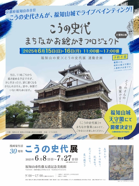 また、こうのが福知山の街と関わりながら創作をする企画「こうの史代まちなかお絵かきプロジェクト」が展開中。その一環として、こうのによるライブペインティングが、6月15日、16日に京都・福知山城天守閣、6月29日に福知山シネマにて行われる。これは6月8日から7月27日にかけて福知山市佐藤太清記念美術館で開催される原画展「漫画家生活30周年 こうの史代展 鳥がとび、ウサギもはねて、花ゆれて、走ってこけて、長い道のり」との連動企画。ライブペインティングは当日11時前後から行われる予定だ。