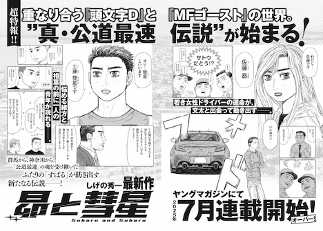 さらにしげのの新連載「昴と彗星」が、7月22日発売のヤングマガジン34号(講談社)でスタート。「頭文字D」の世界と「MFゴースト」の世界が重なり合う“真・公道最速伝説”が描かれる。なおマガジンポケットとヤンマガWebでは、「頭文字D」全巻と「MFゴースト」1巻から22巻までを期間限定で無料公開中だ。