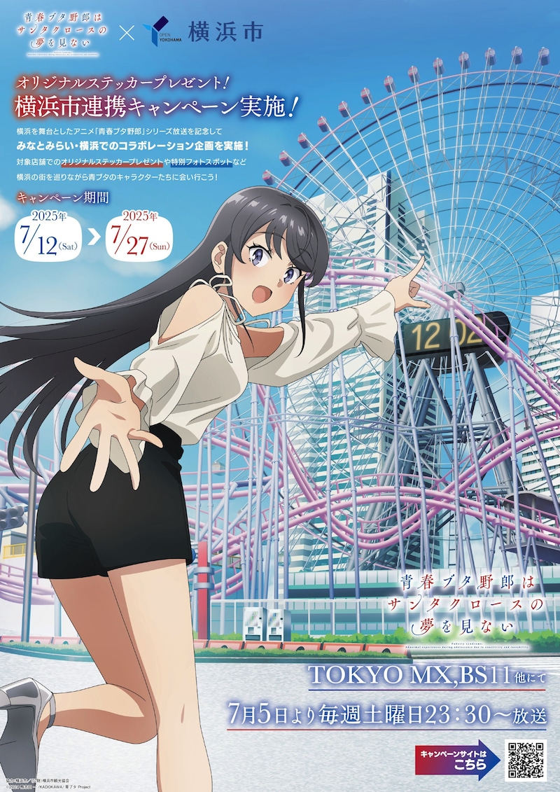 またフォトスポットも7月12日から横浜市内に登場。桜島麻衣のオリジナルボイスが聞けるスポットや、フラッシュ撮影をするとキャラクターが現れるパネル、そして12キャラクターが一堂に会するスタンディなど、各場所で異なるコラボ企画を楽しめる。6月27日からはアニメ「青春ブタ野郎はサンタクロースの夢を見ない」のメイン舞台となる横浜市立大学や金沢区の各所に、桜島麻衣をはじめ大学生編に登場するキャラクターののぼりが登場する。