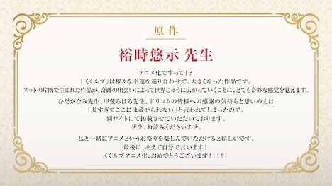 アニメ化を祝し、原作者の裕時、原作小説のイラストを担当するひだかなみ、コミカライズを手がける甲斐ろはるからコメントが到着。またひだかはアニメ化記念イラストとお祝いイラスト、甲斐はアニメ化記念イラストと描き下ろしの4コママンガも寄せている。