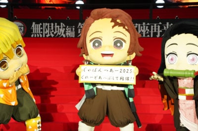 キャストが一旦捌けた後、かわいらしい“みに隊士”15体がゾロゾロと登場。みに隊士たちのグリーティング付き上映会「じゃぱんつあー2025」が、8月から2カ月に渡り20を超える都道府県で行われると発表される。さらに、全国各地のイベントやお祭りなどに現れるラッピングカー「無限城号」もお披露目。片面には鬼殺隊、もう片面には鬼たちがデザインされている華やかな車体が観客の注目を集めた。
