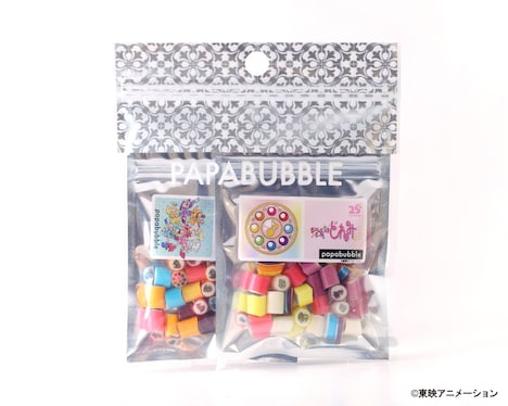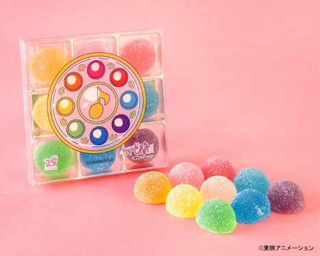 今回新たに仲間入りした「ハナちゃんの魔女帽キャンディ」は、ハナの大好物であるプリンのフレーバー。みんなで協力して呪文を唱える“マジカルステージ”をイメージした枕型キャンディは、どれみ、はづき、あいこ、おんぷ、ももこ、ハナの6人を象徴するカラーで作られた。ラズベリーのフレーバーで、作中の印象的なスイーツ「愛しのトゥルビヨン」から着想を得た味わいを楽しめる。また、魔女見習いの証ともいえる“見習いタップ”をイメージしたグミ「おジャ魔女ドレミ/バブレッツ」も用意。8つのボタンを8色のカラーとフレーバーで再現した。