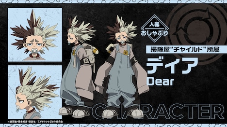 ブロは掃除屋チャイルドの責任者。そんなブロが成長を見守るディアは同じく掃除屋チャイルドに所属する若干10歳の人通者(ギバー)だ。コルバスはゴミから生まれた怪物“斑獣”を退治する組織“掃除屋”のボス、エイシアは掃除屋唯一のヒーラー人通者、ゾディルは荒らし屋のボスというキャラクターだ。高木、佐藤、小山、石見、武内からはコメントも寄せられた。さらに今回キャストが発表されたキャラクターが登場する第8話「前進」の先行カットも到着した。