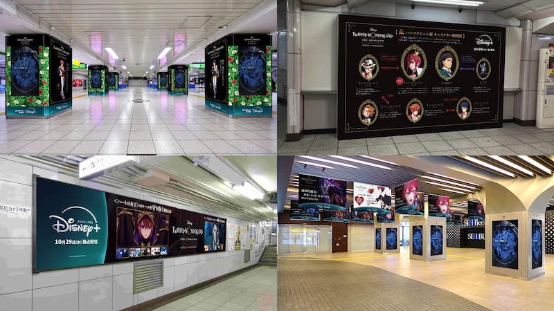 そのほか東京・池袋には駅構内や屋外ビジョンに、本日10月27日から11月2日まで多数の広告が登場。駅構内ではシーズン1の主要7キャラクターのアートを掲出したサイネージや、「ハートの女王の法律」を紹介するフラッグ、インスパイア元となったディズニー映画のヴィランズたちをあしらった柱などが楽しめる。