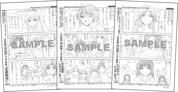 村山渉3社合同フェアで配布されるペーパー3種。(C)MURAYAMA WATARU / (C)SHUEISHA (C)ASCII MEDIA WORKS (C)GENTOSHA COMICS [拡大]