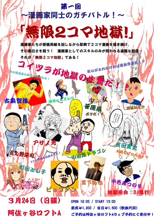 ギャグ系のマンガ家が即興で2コママンガを製作し、その面白さを競う「漫画家同士のガチバトル!無限2コマ地獄!」が、3月24日に阿佐ヶ谷ロフトAにて開催される。