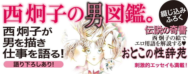 「西炯子画集 男の世界」は、2001年に発売されたイラスト集の新装版。男のみを描いたカラーイラスト50点、解説エッセイ50本、直筆FAXメッセージ44枚、下絵26点が一挙に収められているほか、西のイラストでエロ用語を解説する企画や語り下ろしページも収録された。また仕事場や作画プロセスも公開。付録としてカラー小冊子「おとこの性辞苑」も綴じ込まれている。